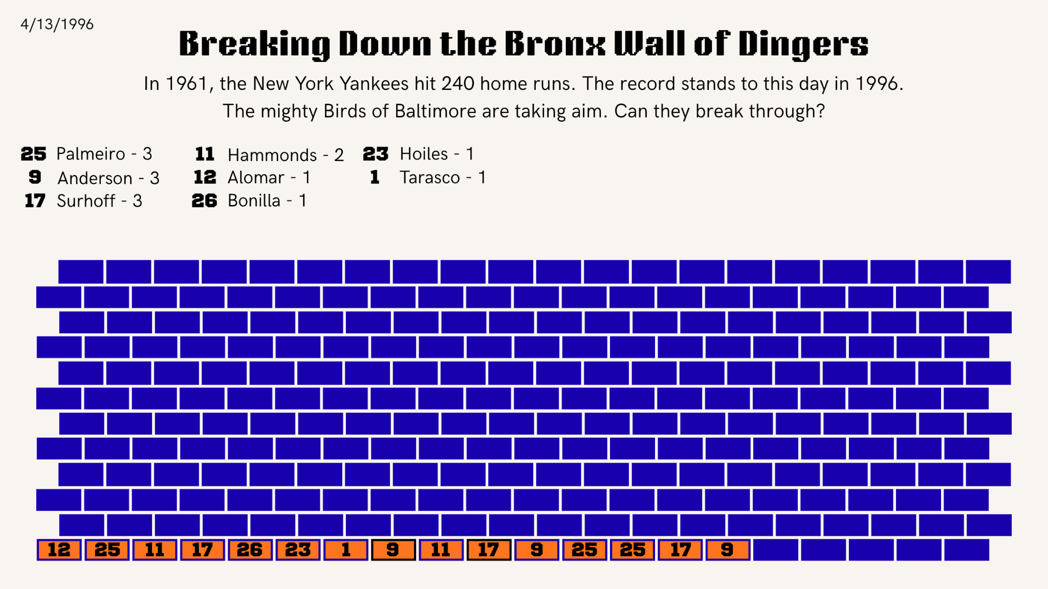 “161-1,” The Baltimore Sun’s Ken Rosenthal started his column. “You laugh. The Orioles might never lose again. … Right now, the Orioles are the Chicago Bulls of baseball.” (Baltimore Sun, p. 1D, April 14, 1996)
