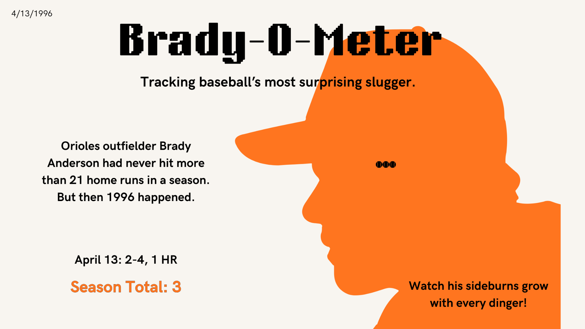 It’s April 13, 1996, and we had the most exciting game of the young season. The Orioles stormed back from five runs down in the fifth inning. After B.J. Surhoff tied it with a homer in the eighth, Brady Anderson ended it with a homer in the 10th.