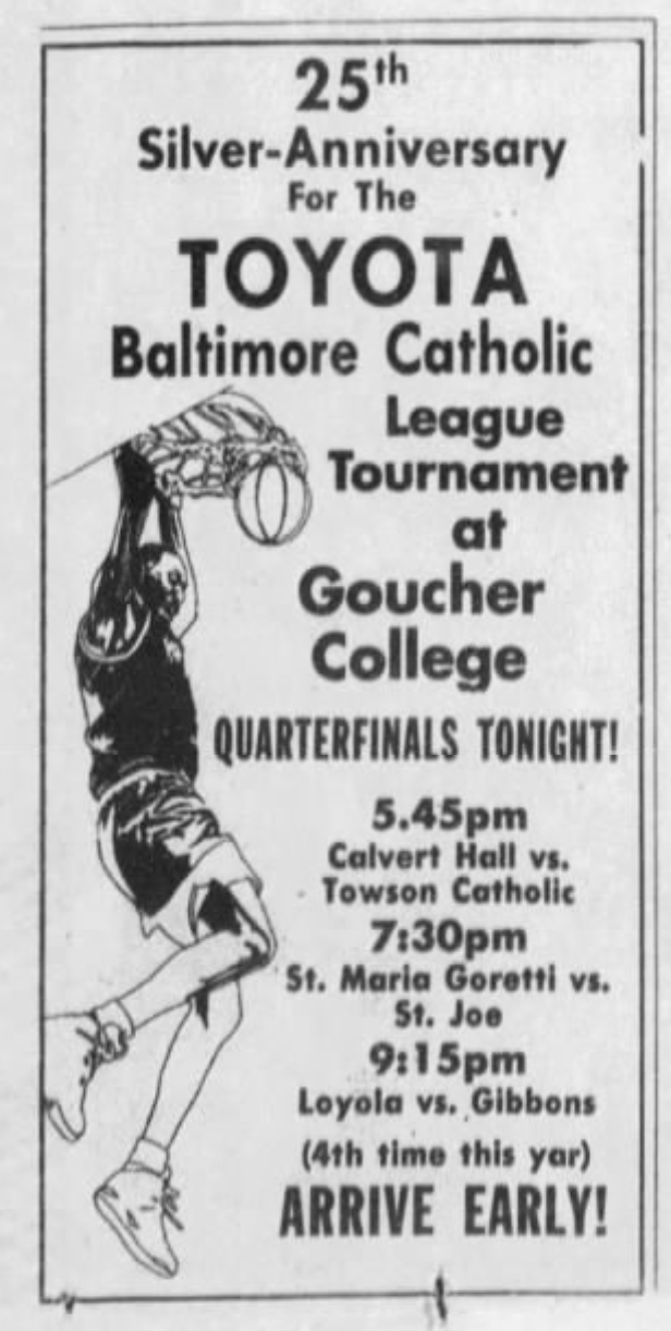 Local hoop heads who remembered to ARRIVE EARLY! were treated to quite a tournament this year as Juan Dixon — long before he led the Maryland Terrapins to their only NCAA tournament title in 2003, and longer still before he became a character on Real Housewives of Potomac — led his Calvert Hall team past Towson Catholic, eventually falling to St. Frances in the Baltimore Catholic League Tournament.