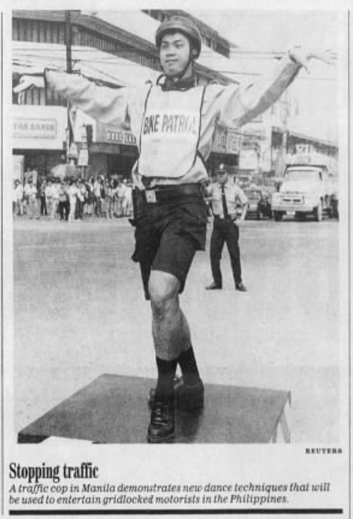 Traffic cops in the Philippines are apparently doing dance routines to “entertain” drivers stuck in gridlock. Maybe we should try this idea on Pratt Street during rush hour.
