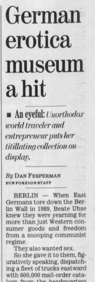 On March 13, 1996, The Baltimore Sun had a staff foreign correspondent in Berlin writing about a museum of East German erotica. It appeared in print next to a lengthy feature on political humorist Molly Ivins written by Sun staffer Laura Lippman. Truly a different era.