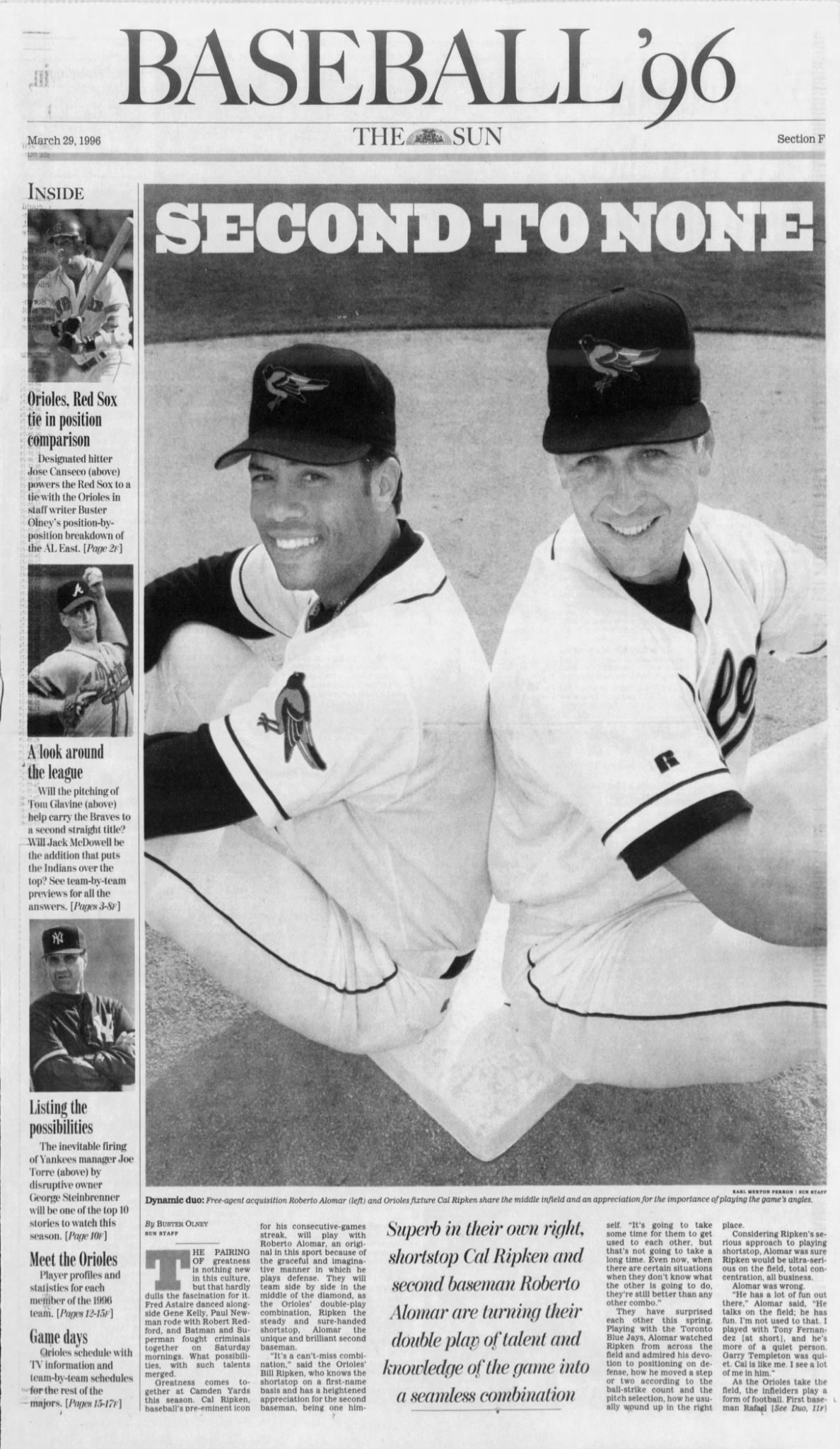 Today’s Sun had an entire section devoted to the new baseball season. It included analysis of every team and little profiles on each member of the O’s Opening Day roster. As you can see, star second baseman Robbie Alomar’s arrival in Baltimore is the big news.